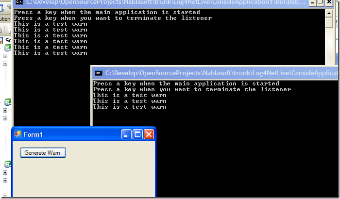 As you can see I create a simple windows form with a button to generate warn, then I can open a simple console application that connects and listen to all generated logs. You can attach how many listener program as you want.