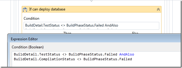 I decided to deploy the database, only if the tests are ok and the build is ok, so I place a condition activity under the test phase and I set the condition to pass only if the test and build status are different from Failed