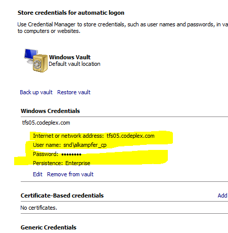 As you can see the original project is the dexterblogengine on tfs05.codeplex.com, and the destination is the Dexter team project on my default colelction. This configuration is not enough, because storing a username and password in configuration is still not supported, so I need to go on Cretendial Manager