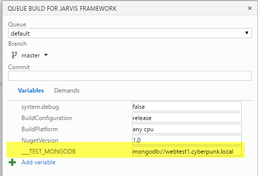If you look at Figure 3, you can verify that I’m able to change the value at queue time, but also, I can simply press “Add variable” to add any variable, even if it is not included in build definition. In this specific situation I can trigger a build and have my tests run against a specific MongoDb instance.