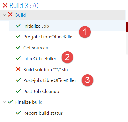 From Figure 3 you can verify that the LibreOfficeKiller is run three times, the first time (1) before the Get Sources phase, then during normal task execution (2) and finally after the last task executed (3). Now my build can run just fine, because I’m able to kill any instance of LibreOffice.exe before the GetSources tasks runs.