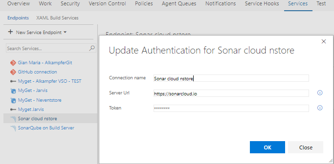 Once you have your project key and token you need to add the endpoint of SonarCloud to the list of available endpoints. You only need to give the connection a name, specify https://sonarcloud.it as Server Url and add the token generated during project creation. ![]()