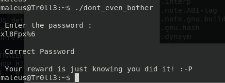 Home folder for maleus contains a dont_even_bother file, it is a 64 bit executable that asks for a password. Using strings on it, to dump all strings contained in the file, indeed seems to dump the password, it seems to easy