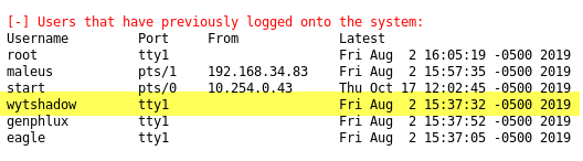After monkeying with the file, I did not find anything useful, so I decided to return to the lineum output to investigate it with more care. A thing that ringed a bell in my mind is looking at the list of last users that logged in into the system.